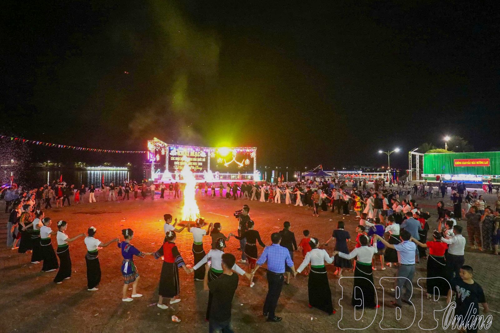 Điểm nhấn giàu cảm xúc của lễ hội năm nay còn được tạo nên từ đêm khai mạc với chương trình nghệ thuật đặc sắc, diễn ra vào tối 2/1/2026 tại khu vực bến thuyền Cơ Khí. Khi màn đêm buông xuống bên dòng Đà giang, không gian lễ hội bừng sáng trong màn trống hội “Âm vang Đà giang”, mở đầu cho chuỗi tiết mục nghệ thuật được dàn dựng công phu, mang đậm hơi thở núi rừng và bản sắc văn hóa các dân tộc Mường Lay.